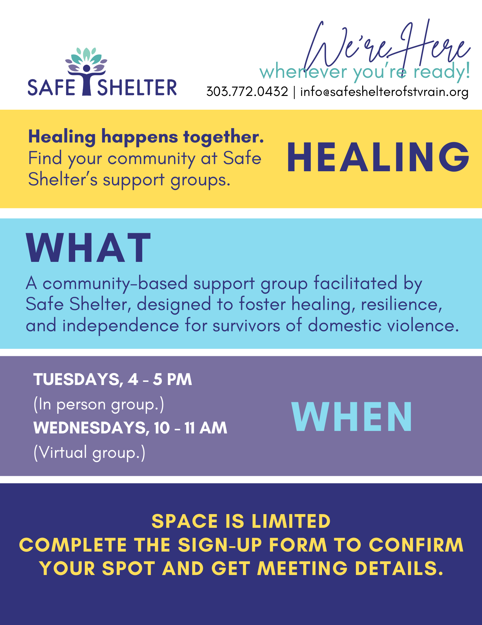 Find your community for healing. Sign-up for more information on Safe Shelter Support Groups.